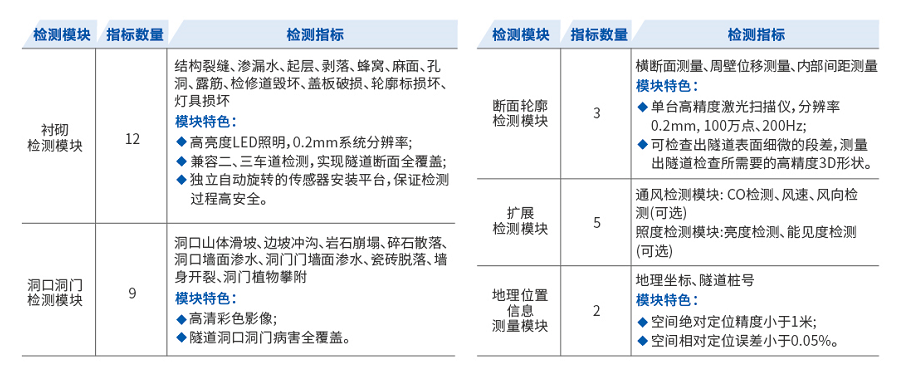 可對(duì)隧道洞口、洞門(mén)、裂縫類(lèi)、滲漏水、起層、剝落、檢修道等病害進(jìn)行快速檢測(cè)。