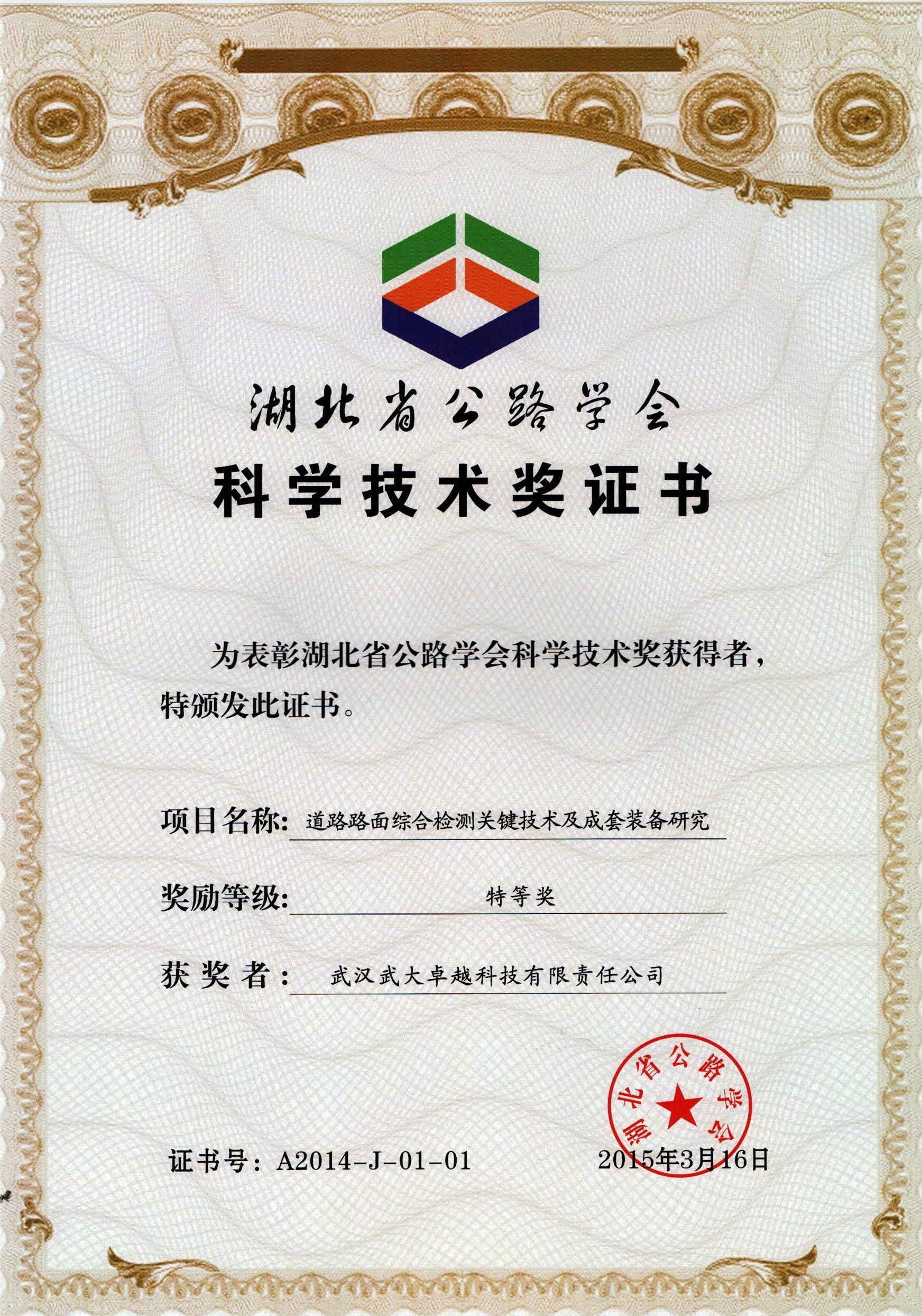 日前,湖北省公路學會主持召開了2014年度湖北省公路學會科學技術獎頒獎大會,卓越科技“道路路面綜合檢測關鍵技術及成套裝備研究”項目脫穎而出,榮獲“湖北省公路學會科學技術獎特等獎”,彰顯了卓越科技的雄厚技術實力與科技研發(fā)實力。