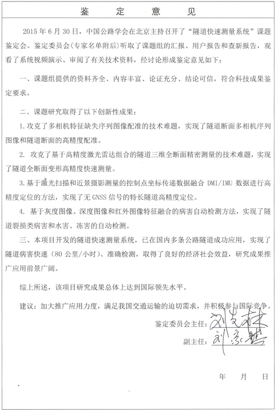 鑒定過(guò)程中,鑒定委員會(huì)聽取了卓越科技的匯報(bào)、用戶報(bào)告和查新報(bào)告,觀看了視頻演示,審閱了有關(guān)技術(shù)資料,經(jīng)討論形成鑒定意見。本項(xiàng)目開發(fā)的隧道快速測(cè)量系統(tǒng),已在國(guó)內(nèi)多條公路隧道成功應(yīng)用,實(shí)現(xiàn)了隧道病害(80公里/小時(shí))、準(zhǔn)確檢測(cè),取得了良好的經(jīng)濟(jì)社會(huì)效益,研究成果推廣應(yīng)用前景廣闊。總之:該項(xiàng)目研究成果總體上達(dá)到國(guó)際領(lǐng)先水平。