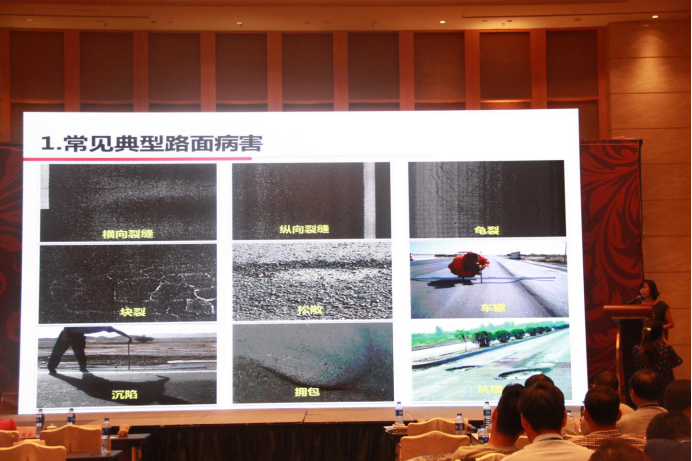 圖為武大卓越總工程師林紅進行“基于3D激光測量技術的路面病害檢測方法”演講