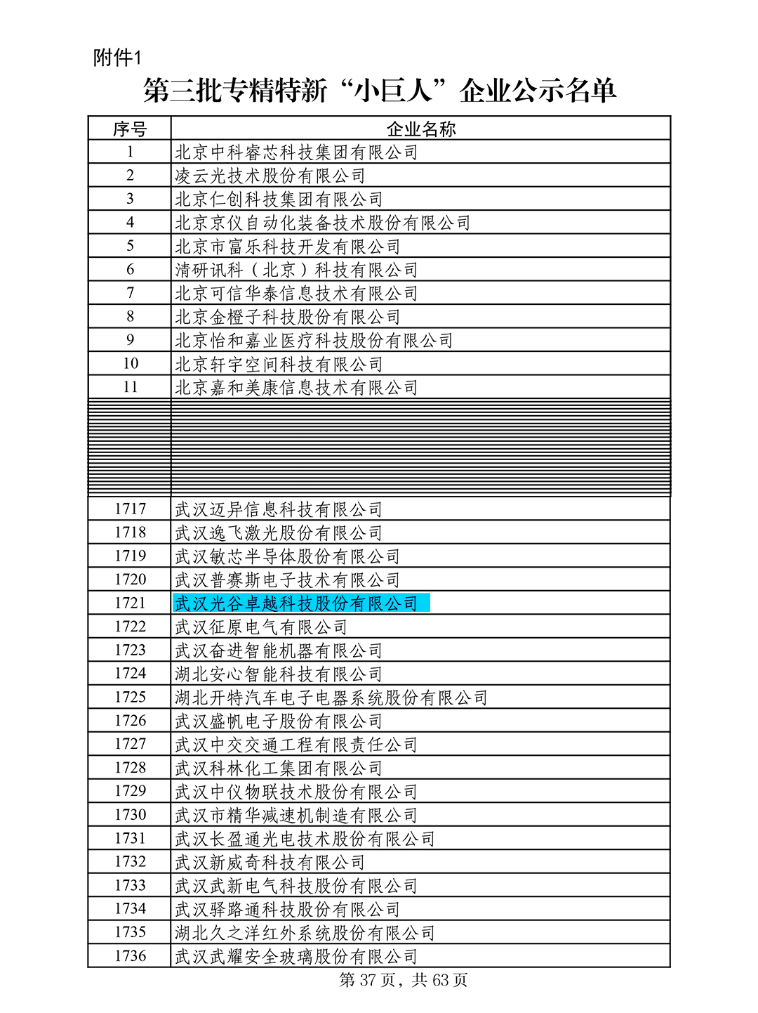 7月19日,工業(yè)和信息化部公布了第三批專精特新“小巨人”企業(yè)名單,共有2930家企業(yè)入選,武漢光谷卓越科技股份有限公司榜上有名!