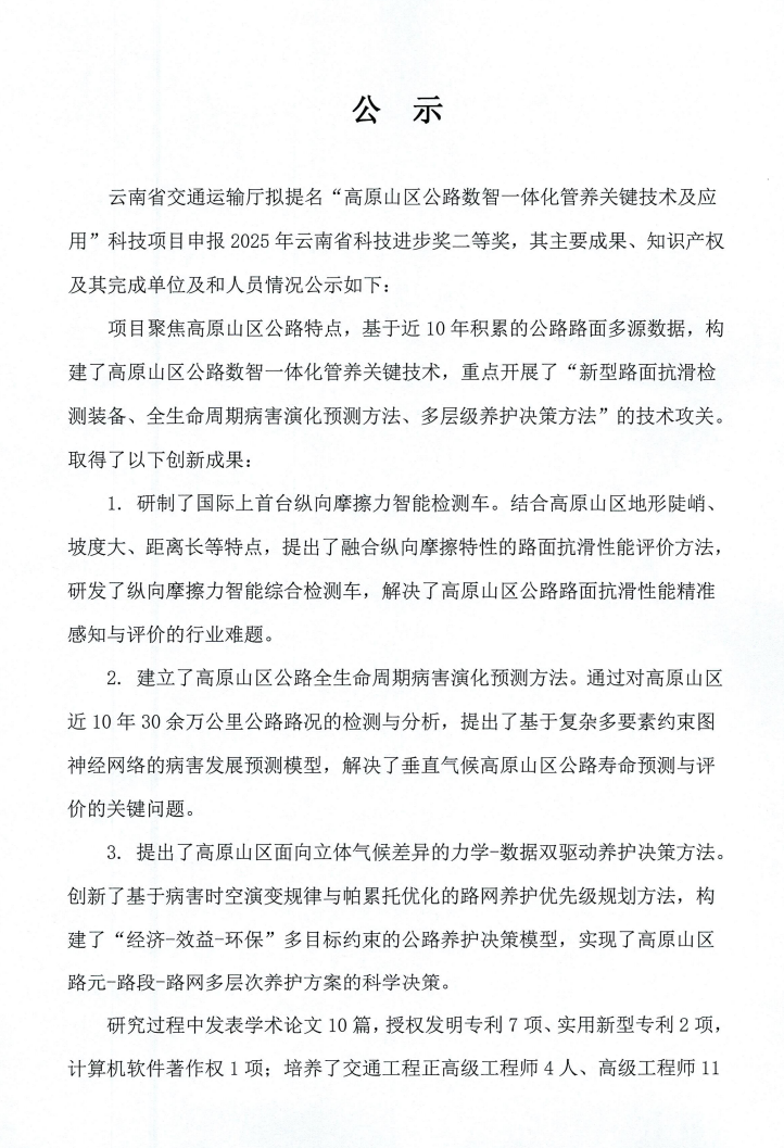 “高原山區(qū)公路數(shù)智一體化管養(yǎng)關(guān)鍵技術(shù)及應(yīng)用”科技項(xiàng)目公示