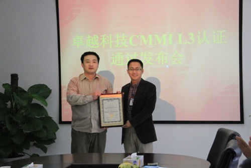 ? 2011年9月21日上午10點,在卓越科技二樓會議室舉行的CMMI?3級認證通過發(fā)布會上,由美國SEI授權的主任評估師劉海笑鄭重宣布:經(jīng)過嚴格的現(xiàn)場審核和評估,卓越科技已經(jīng)達成了CMMI3級的目標,成功通過CMMI3級認證!