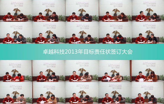 圖為卓越科技董事長兼執(zhí)行總裁曹民與各部門負責人簽訂目標責任狀