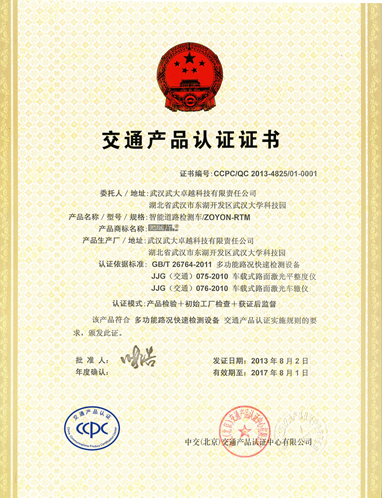 2013年8月2日,武漢武大卓越科技有限責(zé)任公司獲得由中交(北京)產(chǎn)品認(rèn)證中心有限公司頒發(fā)的交通產(chǎn)品認(rèn)證證書。此次認(rèn)證是對卓越科技產(chǎn)品在道路養(yǎng)護(hù)行業(yè)的實力又一次肯定。