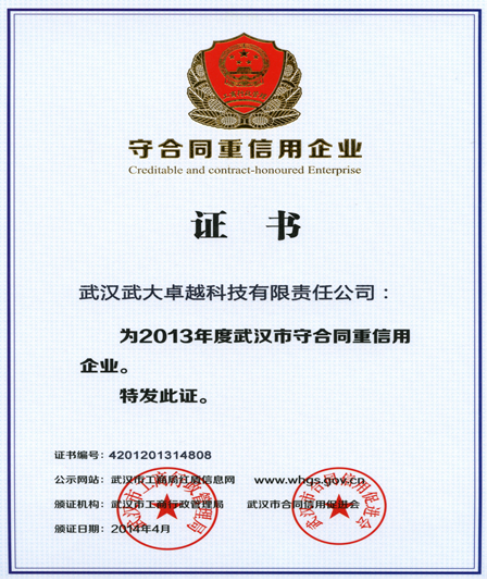 武漢武大卓越科技有限責任公司自公司成立以來,堅持“卓越領(lǐng)先技術(shù),源自客戶體驗”的企業(yè)信念,始終為客戶提供先進的技術(shù)、優(yōu)質(zhì)的產(chǎn)品、完善的服務(wù);企業(yè)經(jīng)營過程中堅持誠信、守法經(jīng)營。2014年6月,卓越科技經(jīng)過嚴格審核,獲得由武漢市工商局頒發(fā)的“守合同重信用企業(yè)”稱號。